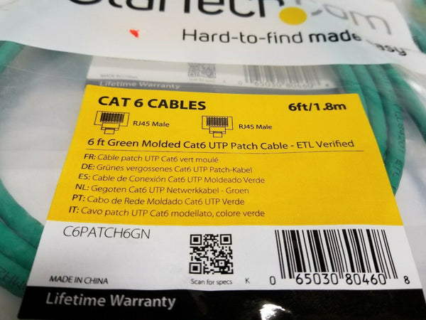 Lot of 10 Startech Green Molded 6ft Cat6 UTP Patch Cable - ETL Verified RJ45Male