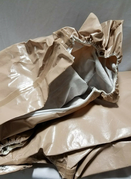 1 Layer: 16 mil , Elastic Wrists and Ankles, Storm Flap ,Taped Seams